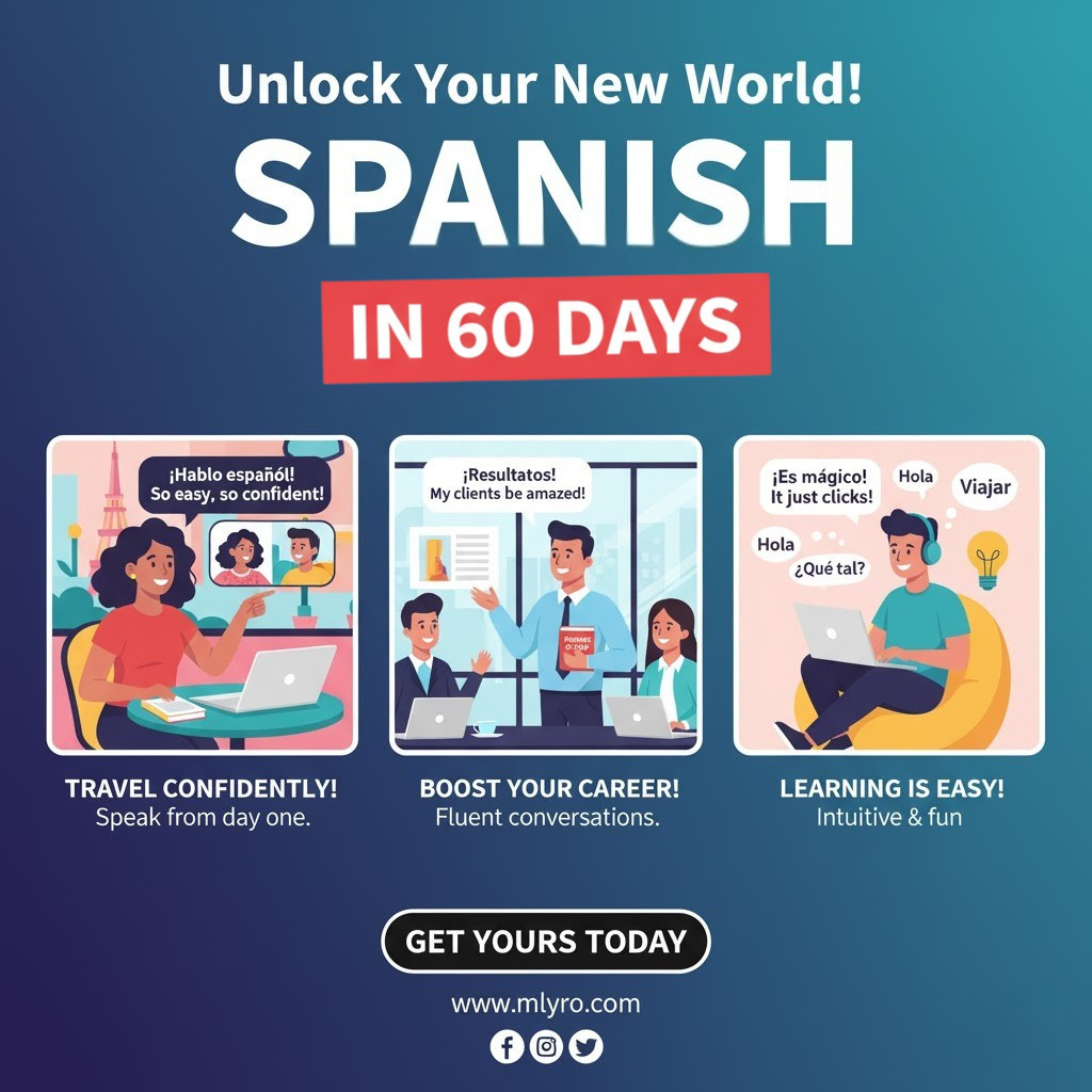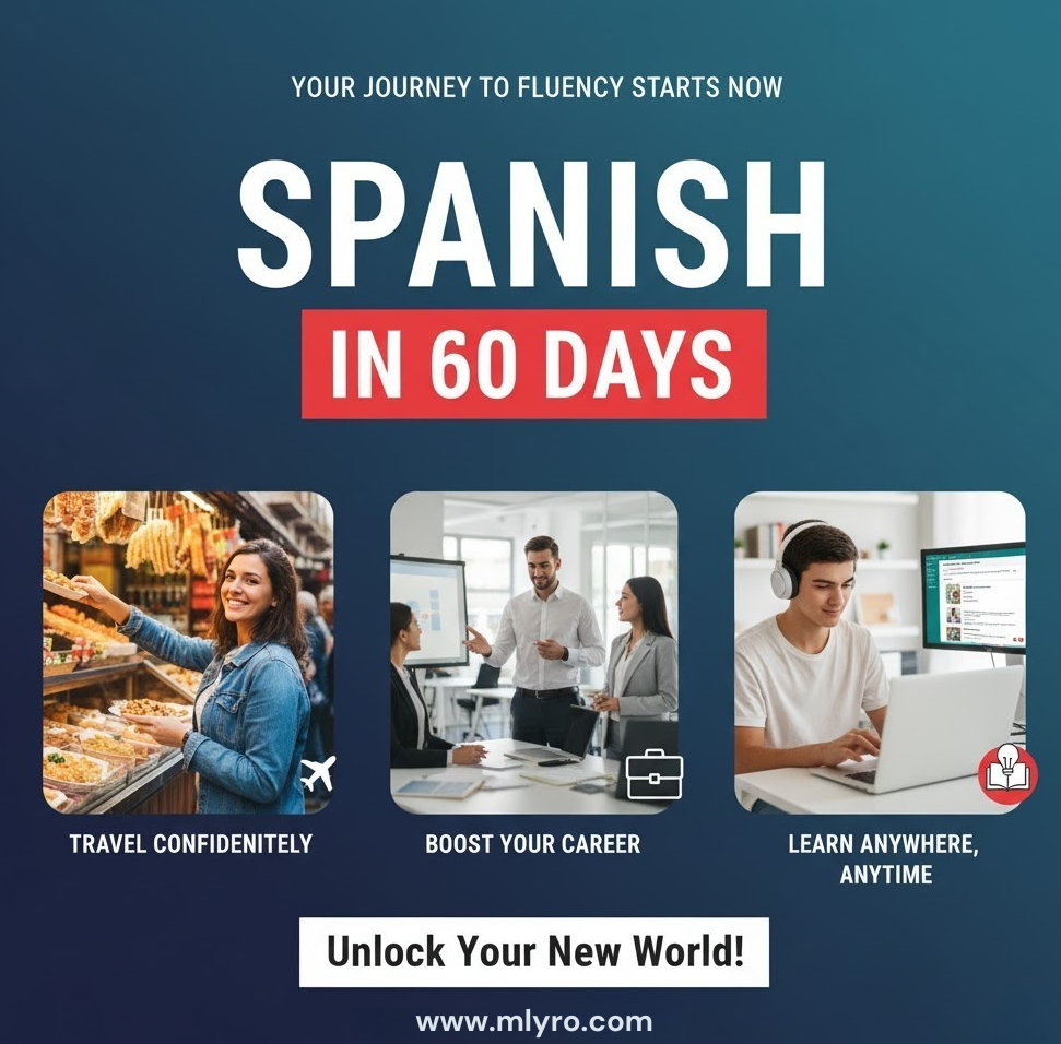 Forget boring grammar lessons. “Spanish in 60 Days” makes learning fun and simple using real-life phrases, interactive exercises, and daily challenges that take just 10 minutes a day.
